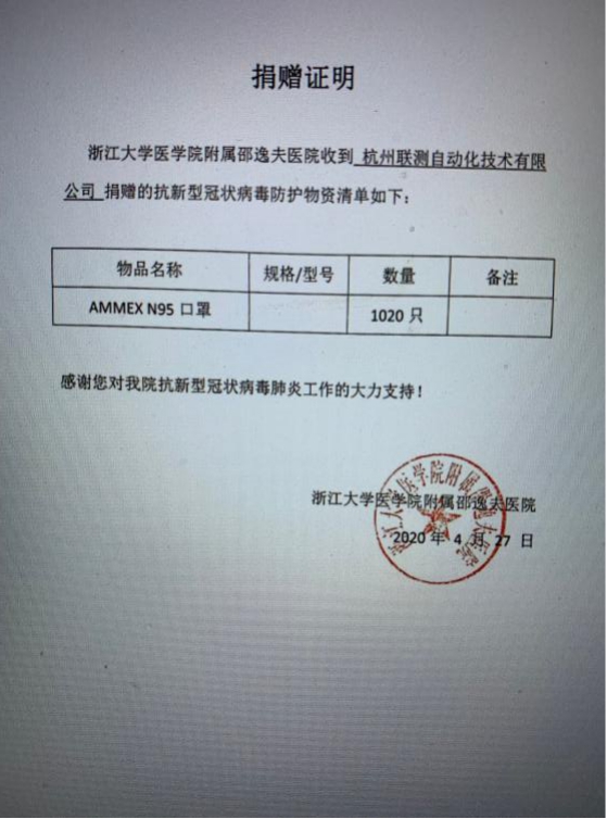 自新冠肺炎疫情爆發(fā)以來,杭州聯(lián)測自動化有限公司累積向邵逸夫醫(yī)院捐贈1020只N95醫(yī)用口罩,為當(dāng)?shù)氐目挂咭痪€的醫(yī)護(hù)人員提供一份保障。