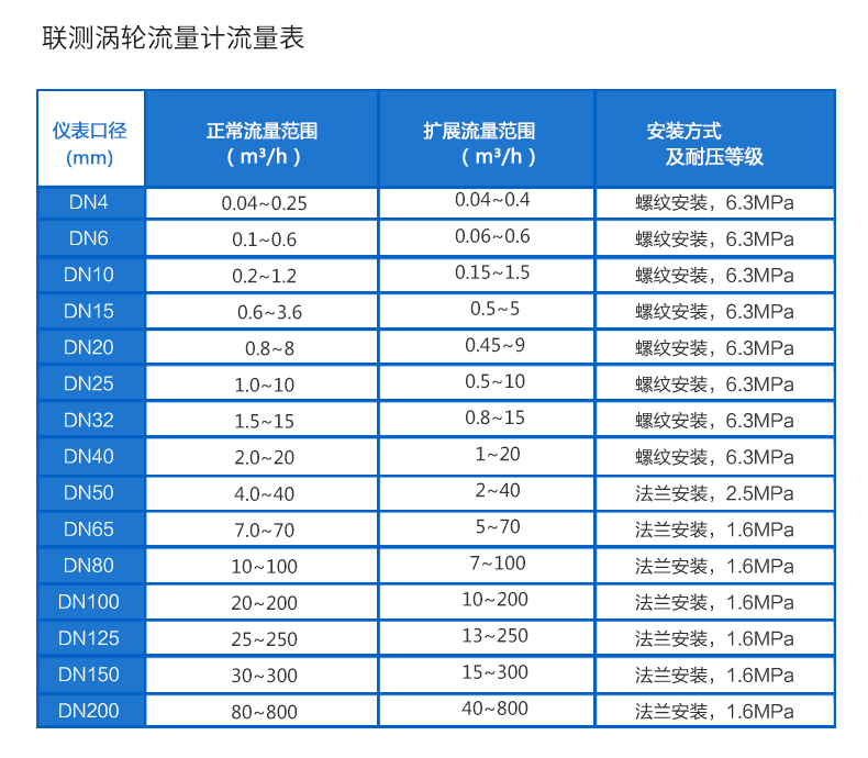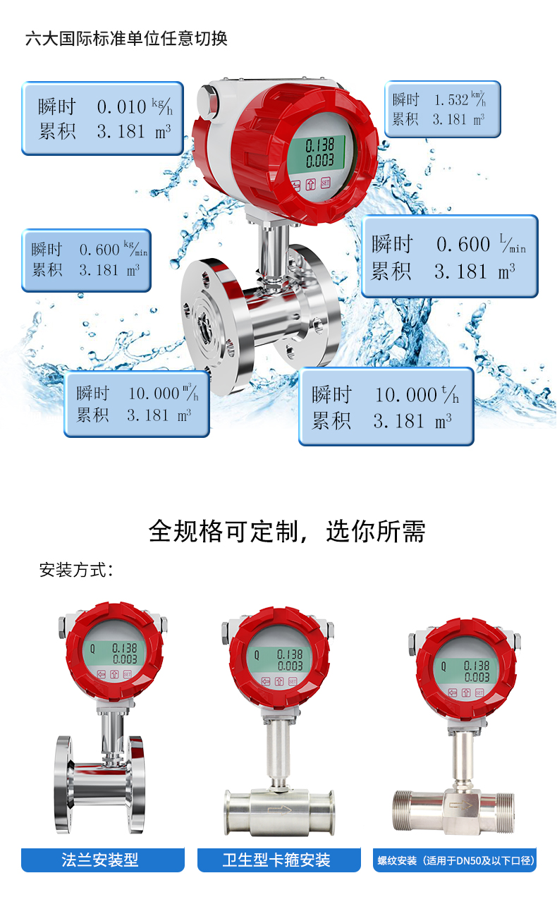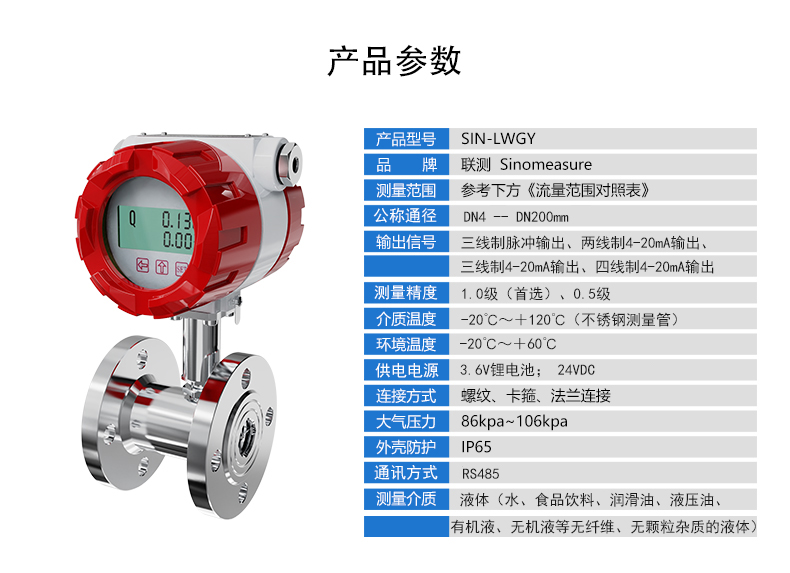 流體流經傳感器殼體,由于葉輪的葉片與流向有一定的角度,流體的沖力使葉片具有轉動力矩,克服摩擦力矩和流體阻力之后葉片旋轉,在力矩平衡后轉速穩定,在一定的條件下,轉速與流速成正比,由于葉片有導磁性,它處于信號檢測器(由永久磁鋼和線圈組成)的磁場中,旋轉的葉片切割磁力線,周期性的改變著線圈的磁通量,從而使線圈兩端感應出電脈沖信號,此信號經過放大器的放大整形,形成有一定幅度的連續的矩形脈沖波,可遠傳至顯示儀表,顯示出流體的瞬時流量或總量。